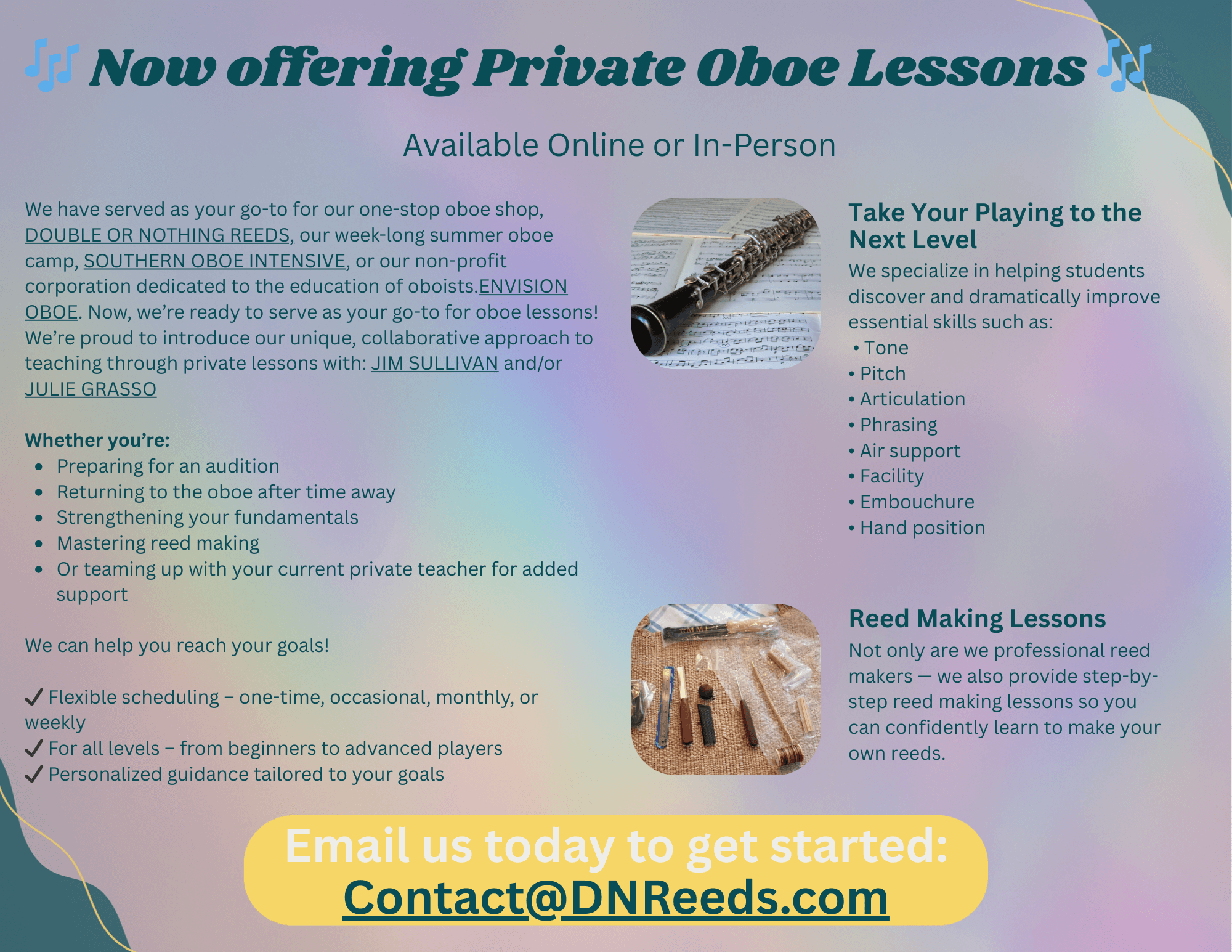 With education at the forefront of our mission, Double or Nothing Reeds strives to sell reasonably priced, top-quality, hand-crafted reeds as well as products that have been personally hand selected. Additionally, our summer camp, Southern Oboe Intensive, provides hands-on experience for oboists of all abilities and age ranges.